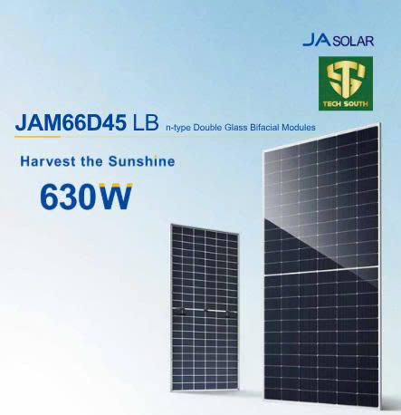 Tấm năng lượng mặt trời JA SOLAR 630W JAM66D45LB – 02 mặt kính do Tech South phân phối chính hãng được sản xuất bởi JA Solar – một trong những nhà sản xuất tấm năng lượng mặt trời uy tín hàng đầu thế giới.