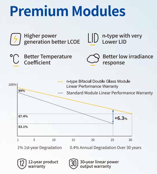 Chúng tôi cam kết rằng với nguyên vật liệu chất lượng và sự tinh xảo trong sản xuất các tấm pin mặt trời giúp duy trì chất lượng vượt trội trong 12 năm. - 30 năm bảo hành hiệu suất